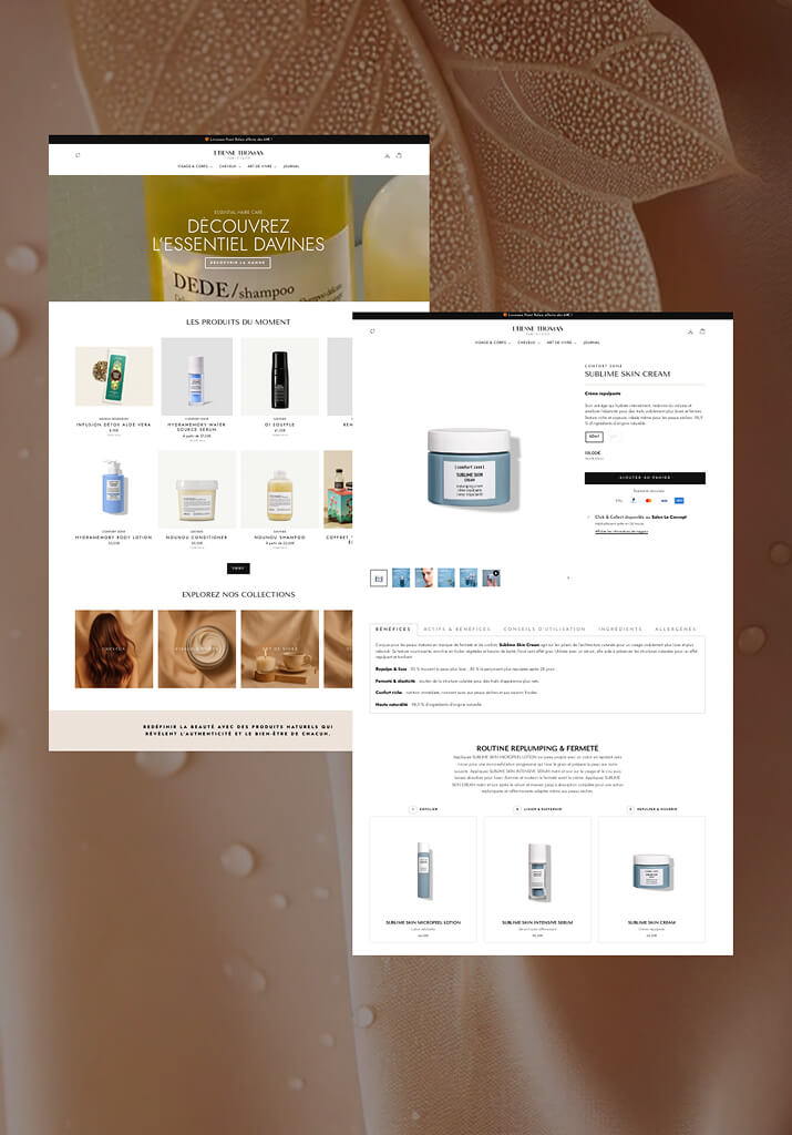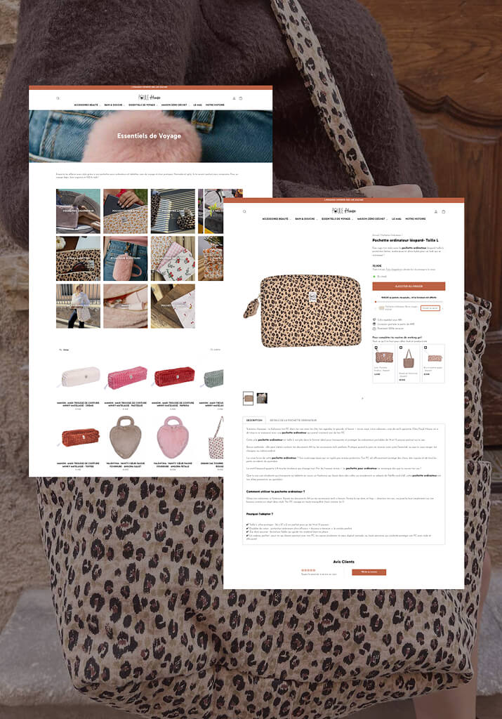 Création d’une interface esthétique, fluide et entièrement alignée avec l’image de votre marque, pensée pour séduire vos clients et faciliter leur parcours d’achat.